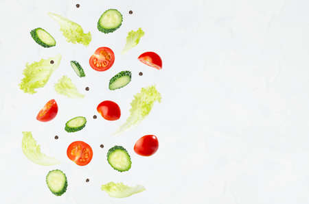 Fresh sliced vegetables for summer salad - cucumber, cherry tomato, green salad - flying on soft light white wall, border, copy space.