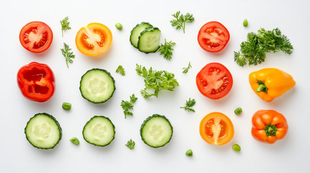 A vibrant assortment of sliced vegetables including cucumber, tomato, and onion arranged neatly with seasoning on a clean white background, perfect for healthy cooking ideas.
