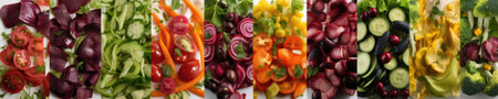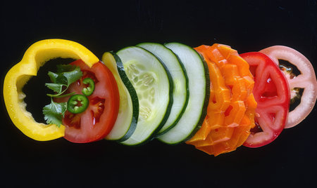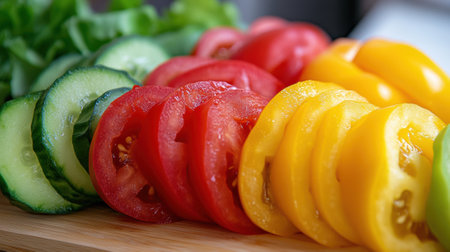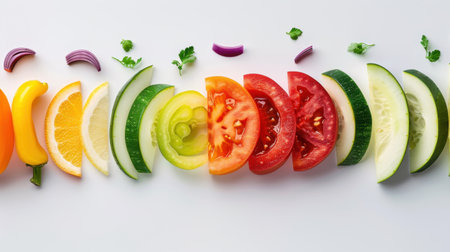A vibrant array of freshly sliced vegetables arranged in a colorful line showcases the beauty of healthy ingredients for culinary inspiration and meal preparation.