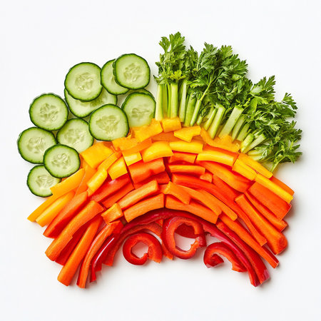 photo of a vibrant veggie platter with carrot sticks, cucumber slices, and bell pepper strips arranged like a rainbow, top-down view, isolated on white background, professional photography --ar 1:1 --v 6.1 Job ID: 3f75caa5-75ab-445f-87a0-91da184e04f2