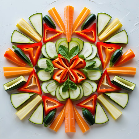 Circular showing radial vegetable arrangement on white surface keywords: vegetables, radial, symmetrical, mandala, food art, arrangement, cucumber, bell pepper, zucchini, carrot, yellow squash, healthy, creative, pattern, organic, fresh, colorful, design, culinary, decoration description: a circular arrangement of sliced and whole vegetables on a white surface, resembling a mandala. slices of cucumber and zucchini form the inner layers, surrounded by wedges of red bell pepper and whole baby...
