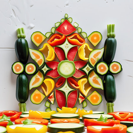 A top-down view showcases a circular arrangement of freshly cut vegetables on a white background. Sliced carrots, zucchini, bell peppers in red, yellow, and orange, and red onion form a colorful mosaic. Some vegetables are cut into decorative shapes, adding an artistic touch.