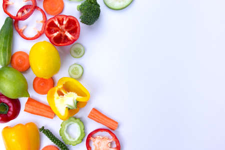 Assorted sliced vegetables on white background. Flat lay. Food vegan concept.
