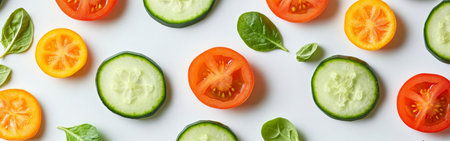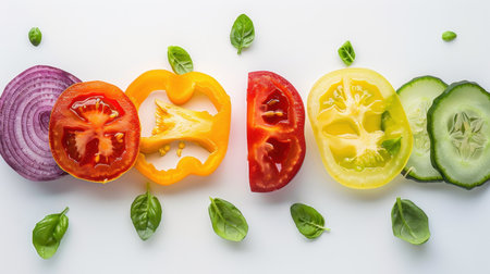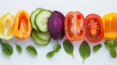 A vibrant display of fresh vegetables including slices of tomato, cucumber, bell pepper, and onion, accented with green basil leaves, ideal for healthy recipes.