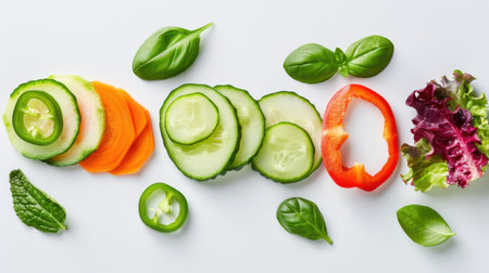 This vibrant arrangement of freshly sliced vegetables and greens showcases a healthy eating lifestyle with colorful cucumbers, carrots, and peppers.