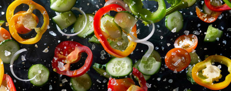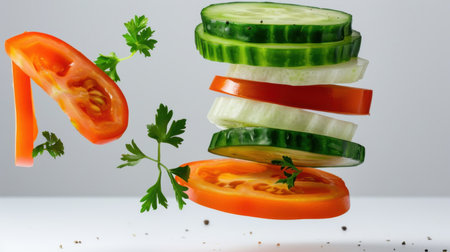Freshly sliced vegetables like cucumbers, bell peppers, and onions, suspended in mid-air, highlighting their crisp textures and vibrant colors.ai generated