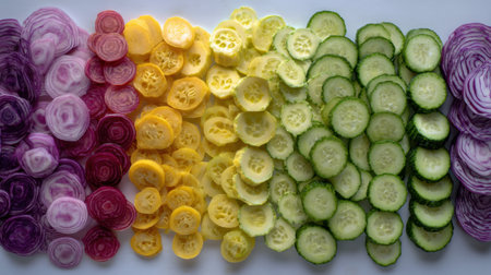 This vibrant image features an artistic arrangement of freshly sliced vegetables, including purple onion, yellow squash, and cucumbers, perfect for culinary inspiration.