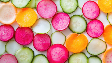 Bright and vibrant assortment of sliced vegetables including radishes, cucumbers, and carrots arranged artistically on a white background, perfect for showcasing freshness and healthy eating options.