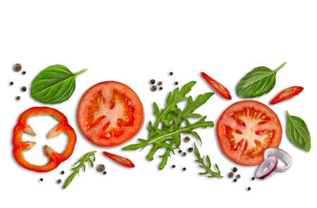 Collage of green leaves of arugula and basil, sliced red spicy and bell pepper, onion and tomatoes, black pepper peas. Isolated on white. Close up