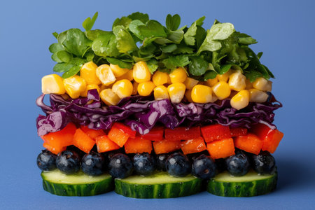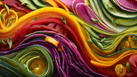 A creative digital illustration depicting Professional stock photo of abstract food art featuring a fusion of fruits and vegetables in a dynamic pattern, natural lighting, artistic food photography style, vibrant and fresh mood, bright and li. This AI-generated artwork features unique visual elements suitable for various commercial and editorial applications. AI-generated illustration.