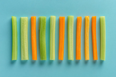Fresh carrot, cucumber, and celery sticks laid out in an organized manner on blue. Perfect for healthy snacks.