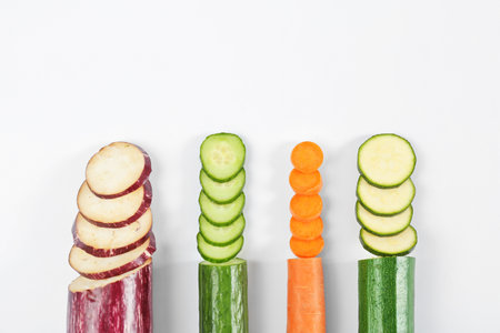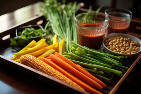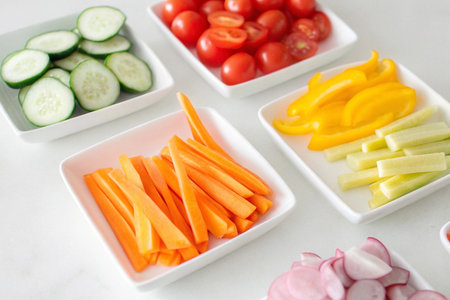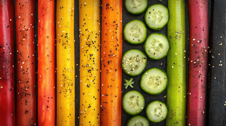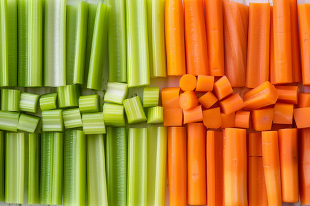 Fresh vegetable sticks such as carrots, cucumbers, and celery arranged in rows with space