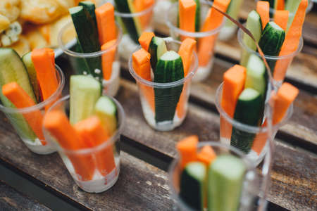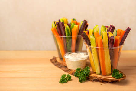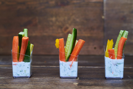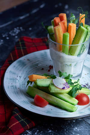 Colorful slices of raw vegetables in glasses (carrots, celery, cucumber, sweet pepper) and yogurt sauce. The concept of diet, healthy and vegetarian food. Selective focus