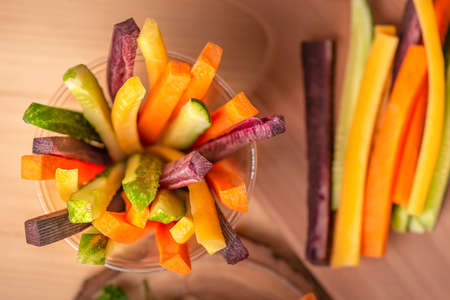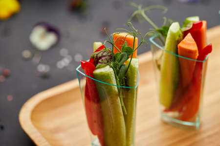 Colorful slices of raw vegetables in glasses (carrots, cucumber, sweet pepper). The concept of diet, healthy and vegetarian food.