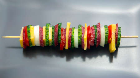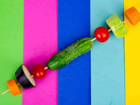 Organic fresh slises vegetables on wooden stick. Vegan or healthy food concept. Minimalistic still life on color bright background