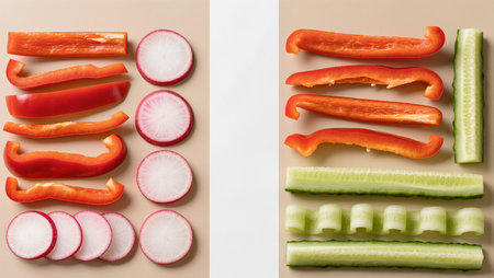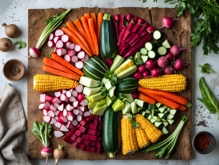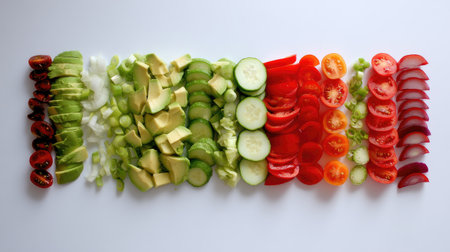 A stunning display of freshly sliced vegetables and fruits showcasing vibrant colors and textures, perfect for healthy recipes and culinary inspirations.