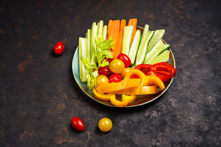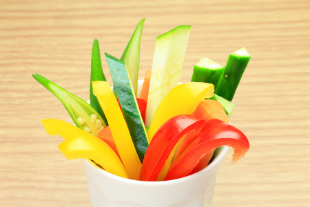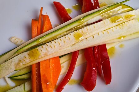 Colorful fresh vegetables cut into strips on a plate.