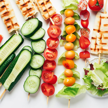 skewers of tomatoes cucumber cheese pita bread and lettuce on a white background, top view