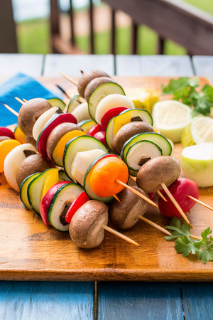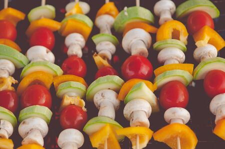 Vegetable and mushrooms kabobs ready to be grilled