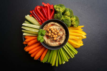 Top view of tasty chickpeas hummus in black plate with fresh vegetables on a black background