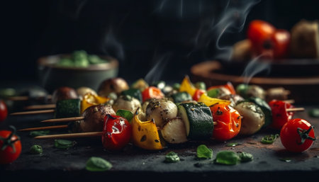 Grilled vegetable skewers with beef and pork, a gourmet appetizer generated by artificial intelligence