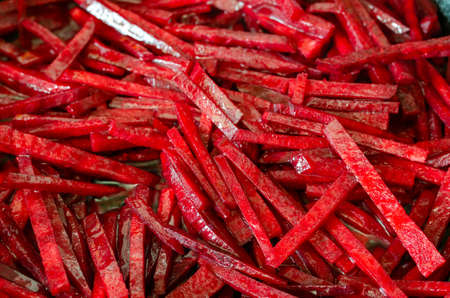 Raw beets sliced into cubes background. The process of roasting red beets in a pan with olive oil. Full frame.