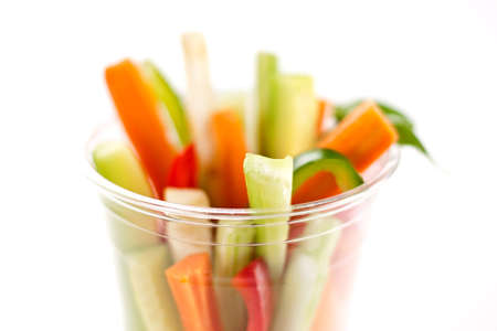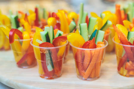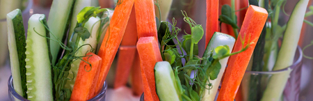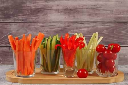 Glasses of assorted raw vegetables - carrot, cucumber