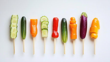 This vibrant arrangement features various vegetable ice pops on wooden skewers, showcasing a healthy, creative snack ideal for summer gatherings and culinary innovation.