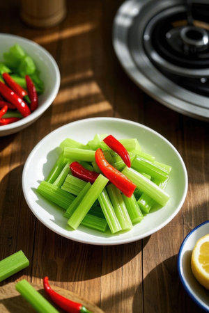 Celery and peppers on a wooden table