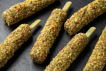 Raw lamb Kofta kebabs on skewers with mix of herbs on rustic stone board. ready to cook