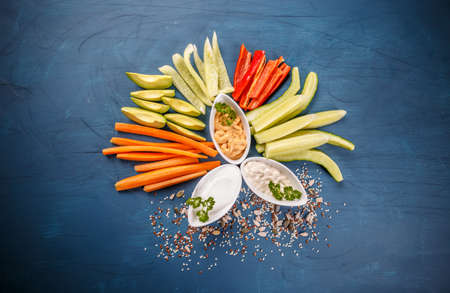 Vegetarian healthy snacks with dips on blue background