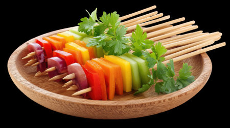 Colorful vegetable skewers resting on wooden plate with parsley garnish on transparent background