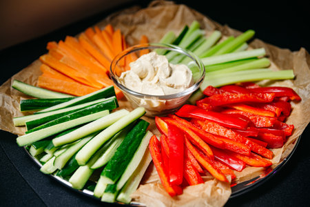 Beautifully decorated catering banquet table with a variety of colorful vegetables and different vegan vegetarian snacks appetizers setting on corporate birthday party event or wedding celebration
