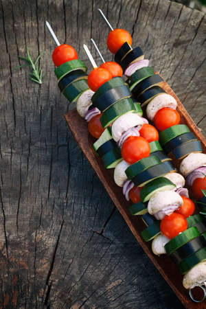 Spring garden barbecue. Vegetable kebabs with cherry tomatoes, zucchini, eggplant on wooden background
