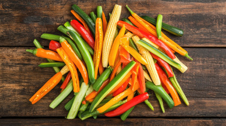 Top view of a colorful mix of Thai vegetables, including sweet peppers, zucchini, and baby corn, on a wooden background