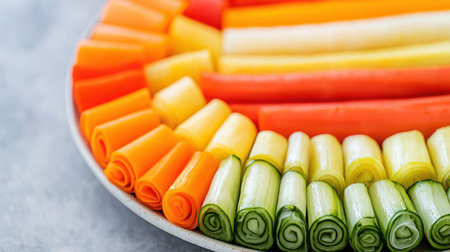 A visually appealing display of colorful rolled vegetables, showcasing a vibrant array of fresh produce arranged artistically to inspire healthy eating.