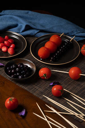 traditional chinese snack called Tanghulu meaning crispy sugar-coated fruits, tomato, strawberry, blueberry, pear and usually shows on festival.