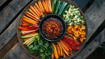A visually appealing vegetable platter featuring fresh, vibrant vegetables arranged around a bowl of spicy dip. Perfect for healthy snacking.