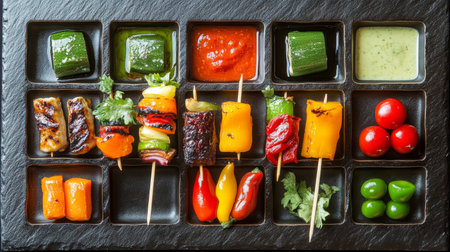 A vibrant arrangement of grilled vegetables on skewers complemented by various dipping sauces, perfect for showcasing healthy eating and gourmet presentation.