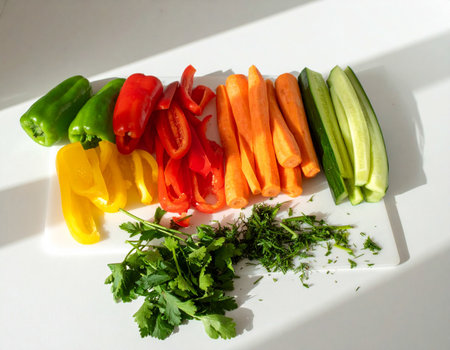 an overhead shot of sliced zucchini, carrots, and bell peppers, created with generative ai