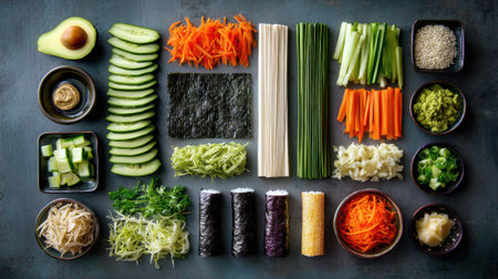 Vegan sushi roll ingredients with avocado cucumber carrots and vegetables neatly organized on dark surface for healthy Japanese inspired meal preparation and cooking.