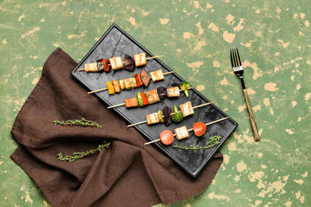 Plate with grilled tofu cheese skewers on color background