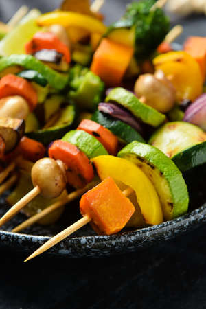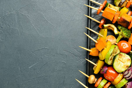 Plate with tasty vegetable skewers on dark background