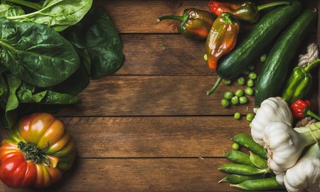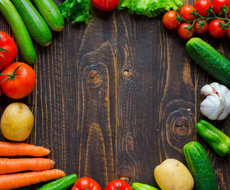 Frame of fresh vegetables on rustic wooden background with copy space. Healthy food concept