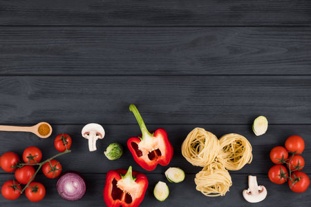Top view on wooden table with italian products peppers, tomatoes, pasta. Copy space for text.