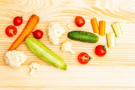 Fresh vegetables still life. Veges lined up on a wooden background, top view, close-up, selective focus, copy space.
