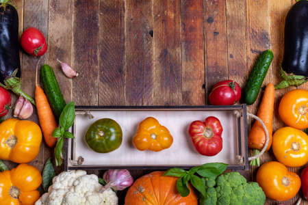 Top view harvest of fresh farm vegetables in small box and on old rustic weathered vintage wooden table. View above. Copy space for text. Advertising healthy natural food. Vegetable harvest.
