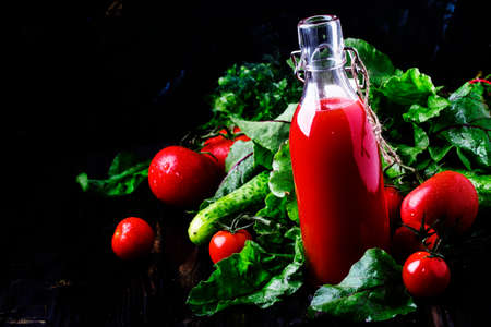 Vegetable juice from tomatoes, cucumbers, beets and spicy herbs in a bottle, low key, selective focus
