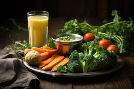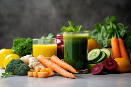 Glass filled with vibrant, fresh juice, surrounded by an array of colorful vegetables, highlighting the importance of healthy eating habits and the detoxifying benefits of natural ingredients