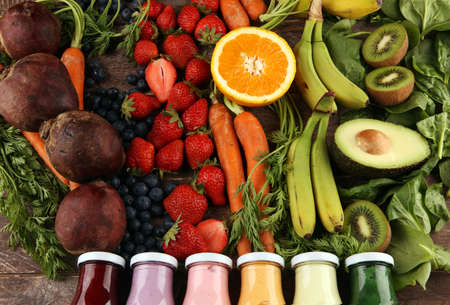 Variety of fresh colorful smoothies for detox weight loss diet. Juices in vacuum bottles with fruit, vegetables and greens ingredients, copy space. Vegan, vegetarian, clean eating, alkaline food